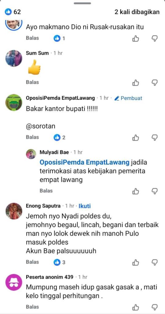 Akun ini bukan sekadar melontarkan kritik biasa. Mereka melancarkan serangan bertubi-tubi, menghujat habis-habisan kinerja Pemerintah Kabupaten Empat Lawang, dan bahkan memicu kebencian publik dengan narasi yang provokatif.